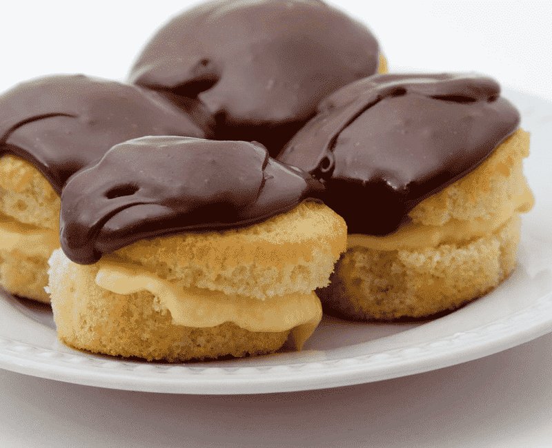 A Boston cream pie is a yellow butter cake that is filled with custard or cream and topped with chocolate glaze.